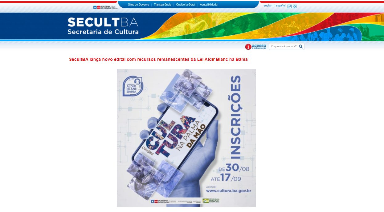 O Edital está disponível no site da Secult-BA e foi elaborado a partir de recursos remanescentes da Lei Aldir Blanc – cujo valor de premiação a cada projeto será de R$ 12.417,08. Serão contempladas 630 propostas que se enquadrem nas seguintes categorias: Difusão Artística, Culturas Periféricas, Culturas Rurais, Memória e Tradições, e Cultura LGBTQIA+.