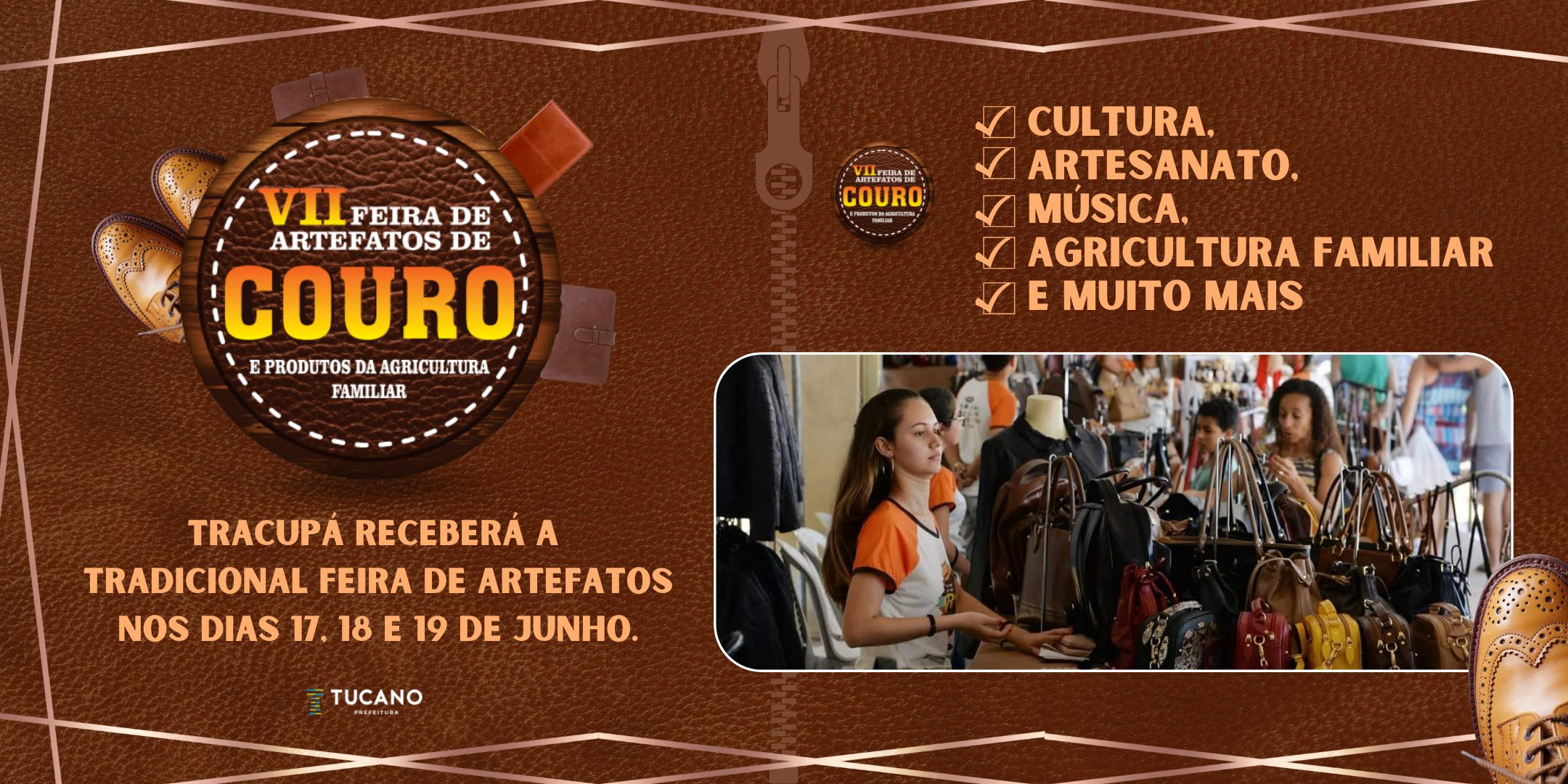 Com apoio do Governo do Estado, por meio da Secretaria de Desenvolvimento Rural (SDR), da Prefeitura de Tucano e do Serviço Brasileiro de Apoio às Micro e Pequenas Empresa – Sebrae, o distrito de Tracupá vai receber a VII Feira de Artesanato de Couro e Produtos da Agricultura Familiar entre os dias 17 e 19 de junho. O evento é uma iniciativa da Cooperativa dos Produtores de Artefato de Couro da Comunidade de Tracupá (Coopact).