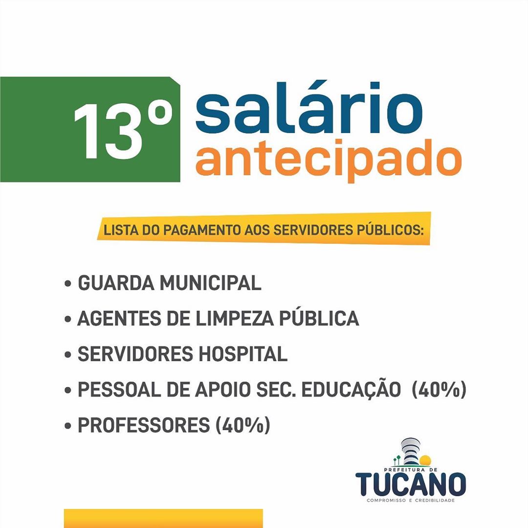 O Governo Municipal está antecipando o pagamento do 13° salário de algumas categorias da Prefeitura de Tucano, a exemplo da Guarda Municipal, agentes de limpeza pública, servidores do hospital, além do pessoal de apoio da Secretaria Municipal de Educação.