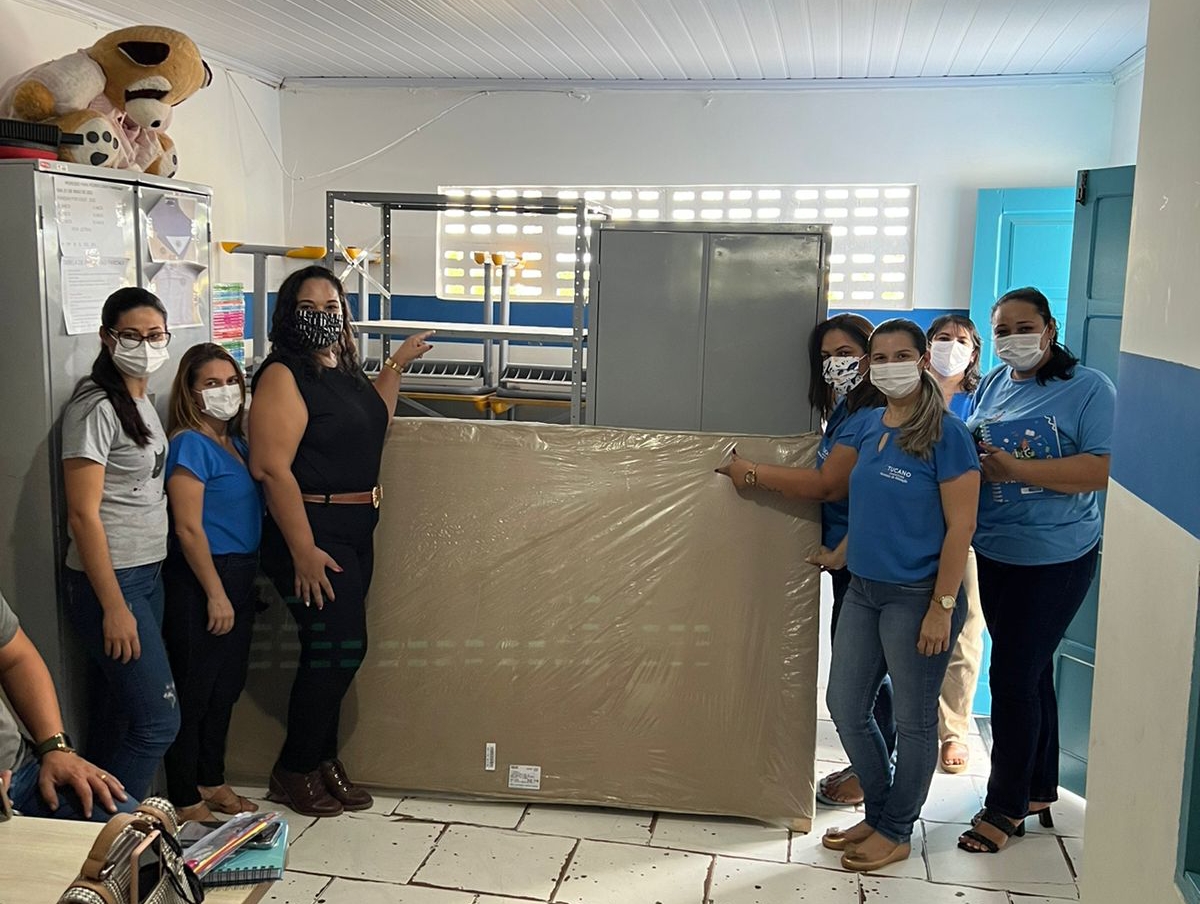 Cinco escolas foram contempladas com fogões, bebedouros e liquidificadores industriais, TV Led 32’, purificadores de água, refrigeradores, armários, arquivos e estantes de aço, mesas e quadros brancos: