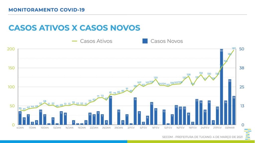 Os principais números dessa semana registram recordes em Tucano. De acordo com a Secretaria de Saúde e a Vigilância Epidemiológica, são 197 casos ativos (pacientes com diagnóstico confirmado e ainda não apresentaram cura). Destes, 115 foram registrados somente nos últimos cinco dias.